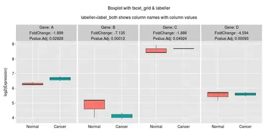 facet_wrap(~Gene+FoldChange+Pvalue.Adj,ncol=2) + ylab("log2(Expression)\n") +
