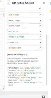 I am experimenting with Named Functions in Google Sheets and trying to make a function to take start and end date arguments to look between within a custom formula. I cannot figure out how to put the dates in a preset comparison and work properly. (i.e. ">=start_date") will not accept the start_date as an argument of the named function.If the start_date variable is outside the parentheses, a formula parse error occurs.