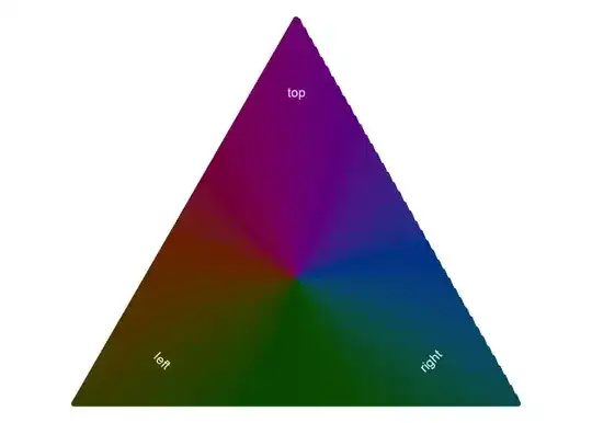 I have a problem with gradient fill of geom_polygon(). I created a triangle, and I need to fill it with three colors. Each color should start in each angle of a triangle, and then they mix in the middle as gradient. I have this code below, but the triangle is fully filled with black. I also need to insert text labels next to each angle.