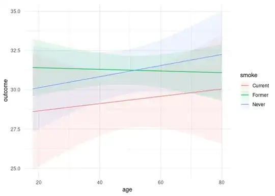 In other words, for my cplot() line at the end of the code block, how can I get the plot to show the predicted values for increments of 'age' by the levels of 'smoke'?