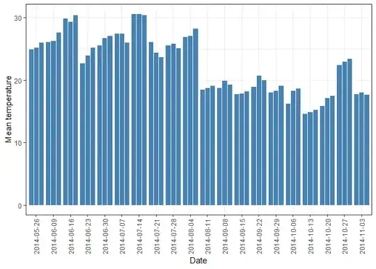 I want to create a graph to visualize hourly weather data within each week, where each column/line represents one hour's data for each week. To make x-axis similar to my experimental data figure, I added a date2 column using mutate(date2 = first(date)). I had to create date2 because the duration of the experiment was not exactly one week, I can't use 1 week in scale_x_date()