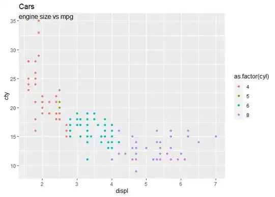 gg <- ggplot(mpg,aes(displ,cty,color=as.factor(cyl))) + geom_point() +