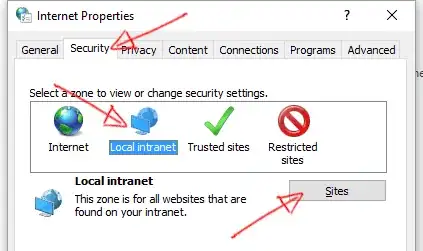 - Click on the "Security" tab, then select "Local intranet" icon and click on "Sites" button.