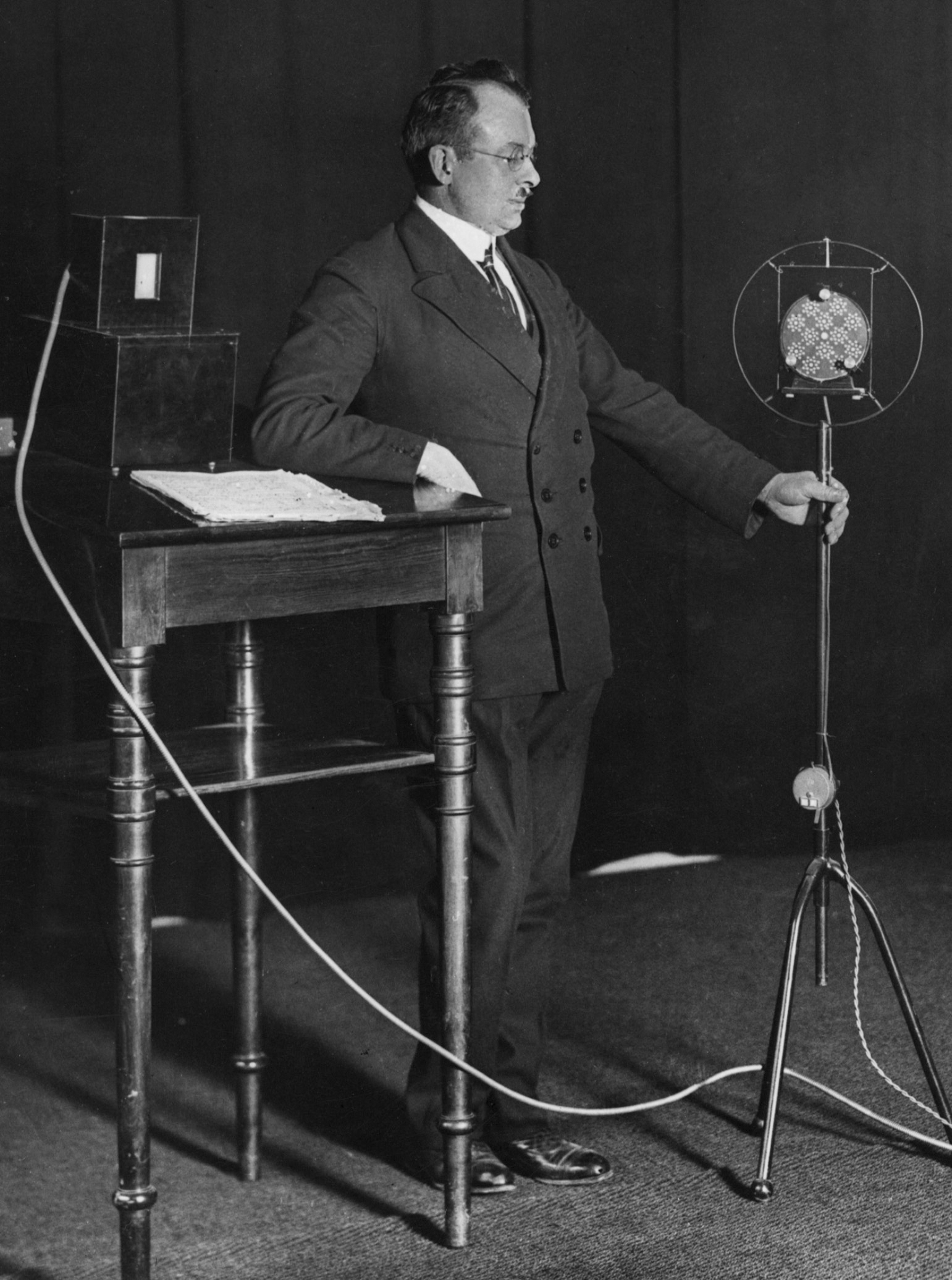 - Hans Bodenstedt mit 2 Mikrophonen (“Telegraphon” [Kohle] und Bändchen [el-magn.])