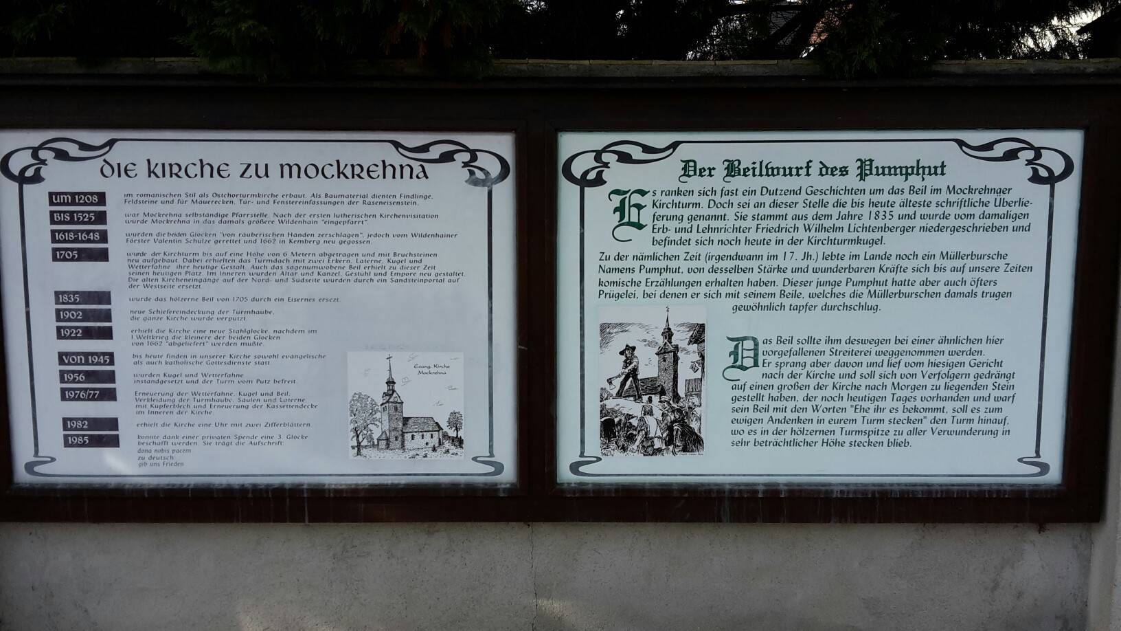 Der Sage nach saß der auch als Hexenmeister der Oberlausitz bekannte Martin Pumphut eines Abends als Wandergeselle in einem Mockrehnaer Wirtshaus, neckte die Bauern und den Müller, zeigte Kunststücke mit seinem Beil, bis ein neu hinzugekommener Gast rief: „Das ist der Zauberer, er ist mit dem Teufel im Bunde, nehmt ihm sein Zauberbeil!“ Pumphut sprang hinaus, rannte auf den Friedhof. Und als die ihn verfolgende Menge ihn packen wollte, schwang er sein Beil und ließ es unter Zischen und Krachen an die Kirchturmspitze fliegen, wo es stecken blieb. Alle schauten hinterher, und Pumphut verschwand unter einem großen Stein. Danach wurde er nie wieder gesehen.[5]