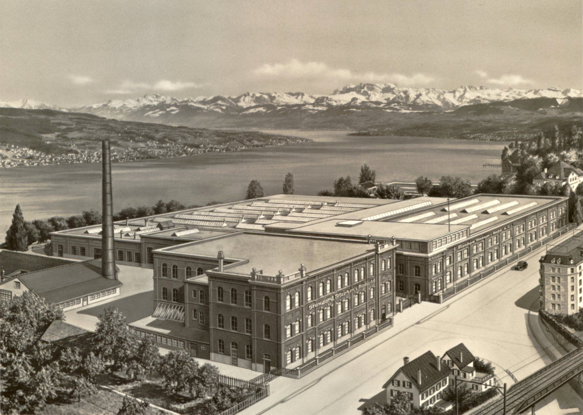 Die Rote Fabrik wurde 1892 nach Plänen des Architekten Carl Arnold Séquin für die Seidenfirma Henneberg erbaut und 1896 durch ein grosses Bürogebäude (s. Bild) ergänzt. Für den Bau der Shedhalle musste der Seegrund aufgeschüttet werden. 1899 übernahm die Seidenwebereien Stünzi Söhne aus Horgen beide Gebäude. Nachdem die 1935 gegründete ITT-Tochter Standard Telephon und Radio AG (STR) ab 1936 stückweise immer mehr Fläche gemietet hatte, erwarb sie 1940 alle Gebäude. Sie ergänzte 1952 das Fabrikgebäude an der Stelle einer vorher vorhandenen Eckkuppel mit einem eingeschossigen Aufbau (ganz rechts im oberen Bild).[1] Ein Luftbild aus dem Jahre 1919 zeigt noch den alten Zustand des Fabrikgebäudes mit der Eckkuppel.