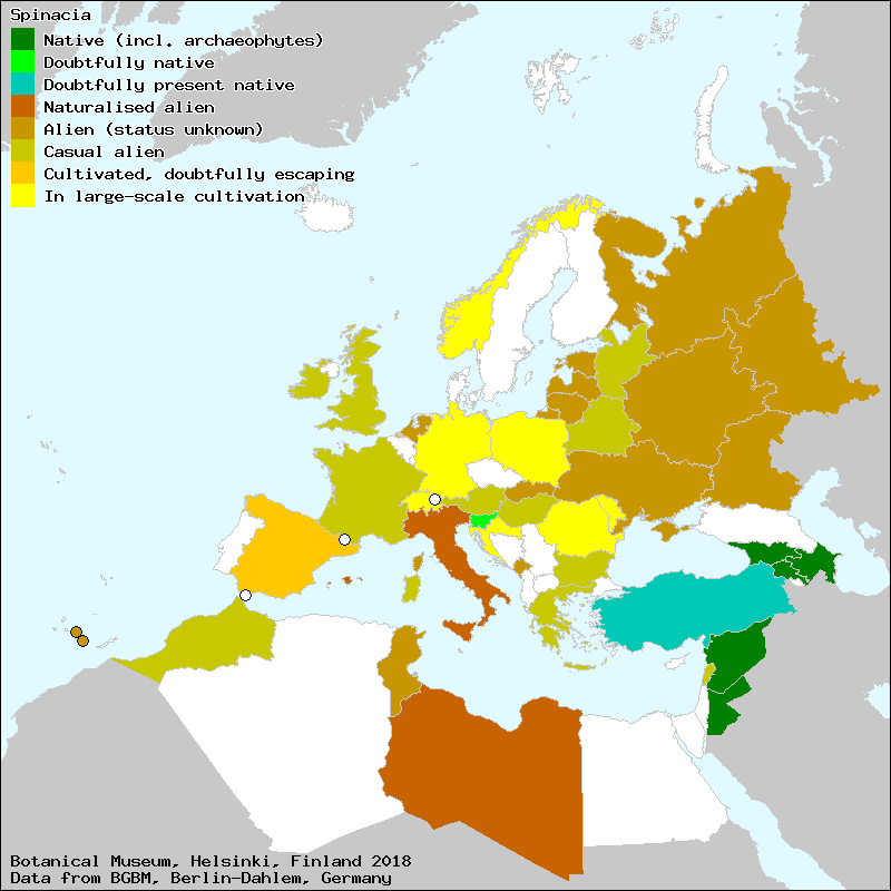 Die Gattung Spinacia ist ursprünglich in Westasien und Mittelasien verbreitet. Schon lange ist sie im Mittelmeergebiet eingebürgert[3]. Eingeführt als Kulturpflanze oder verwildert als Adventivpflanze kommt Echter Spinat in gemäßigten und subtropischen Regionen von Europa, Asien und Nordamerika[4] vor.