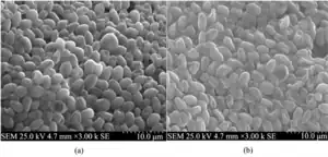 SEM-Aufnahme von Cereibacter sphaeroides unter a) Mikrogravitation und b) unter normaler Schwerkraft (früher Rhodobacter sphaeroides) | ||||||||||||