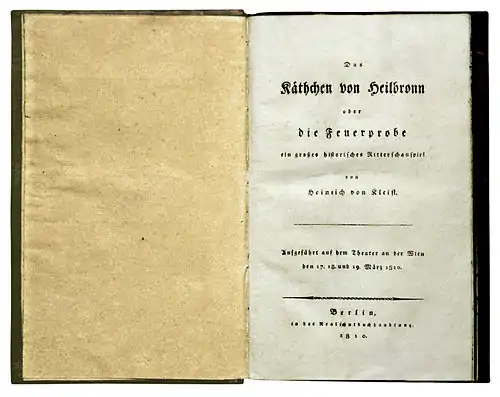 Kleist, H. von: Das Käthchen von Heilbronn oder die Feuerprobe / ein großes historisches Ritterschauspiel. Aufgeführt auf dem Theater an der Wien den 17., 18. und 19. März 1810. Berlin: Realschulbuchhandlung 1810.