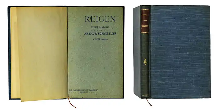 Schnitzler, Arthur: Reigen. Zehn Dialoge. Von Arthur Schnitzler. Winter1896/97. Als unverkäufliches Manuskript gedruckt. [Ohne Ortsangabe], Buchdruckerei Roitzsch vorm. Otto Noack & Co., Exemplar Nr. 61 von 200, 94 n. pag. Bll., 1 B. Vakat. Auf S. [1] vom Dichter nummeriert, signiert und dem österreichischem Operettenkomponist Charles Weinberger (1861 -1939) gewidmet, datiert auf Mai 1900 ( → Folgeseite). Originalbroschur, eingebunden in zeitgenössischem Leinen-Einband Oktav mit goldgeprägtem Rückentitelschild und dezentem goldgeprägtem Rückenschmuck. Erstausgabe, signiert.