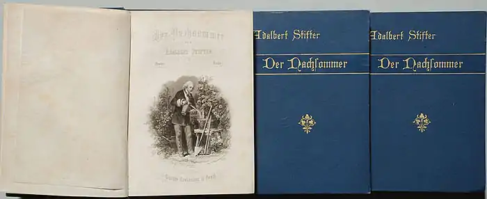 Stifter, Adalbert: Der Nachsommer. Eine Erzählung. Pesth: G. Heckenast 1857, 3 Bde. 483, 420, 444 S., Titel von Bd. 1 als Lithographie;
