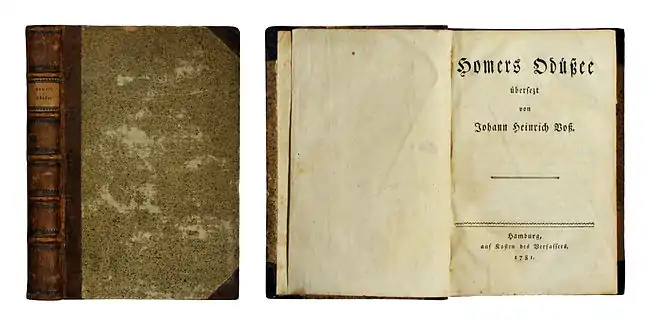 Voss, J. H.: Homers Odyssee übersetzt von Johann Heinrich Voss. Hamburg, auf Kosten des Verfassers 1781, 468 S., 8 nicht pagin. Blätter mit dem Verzeichnis der Subskribenten, Erstdruck. Halbleder der Zeit Oktav.